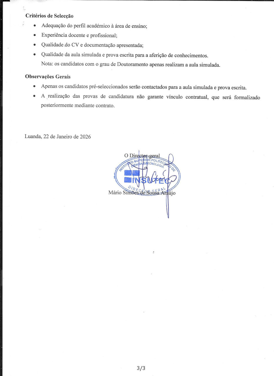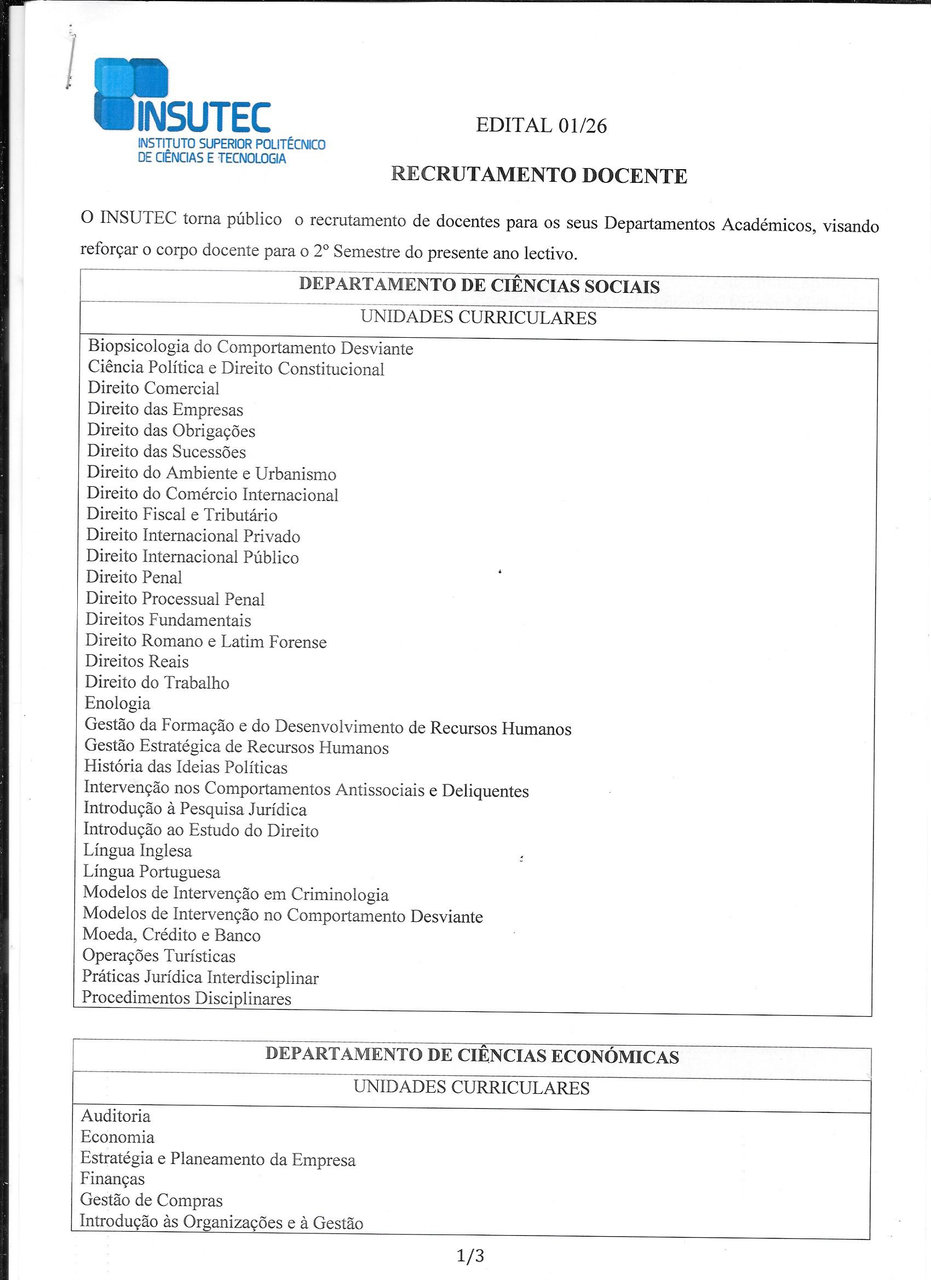O INSUTEC torna público o recrutamento de docentes para os seus Departamentos Académicos, visando reforçar o corpo docente para o 2º Semestre do presente ano lectivo.